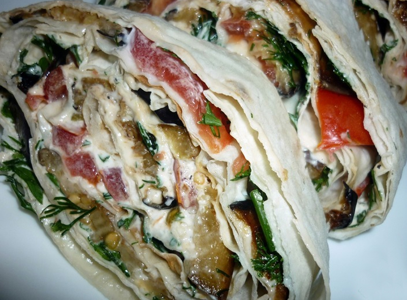 Poukładaj smażonego bakłażana na tortilli i posmaruj go kwaśną śmietaną. Na wierzchu połóż pokrojone pomidory. Jeśli lubisz, dodaj czosnek.