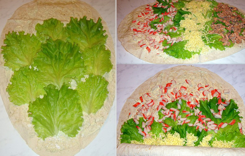 13. Na początek poukładaj sałatę lub kapustę pekińską na tortilli. Po jednej stronie ułóż ulubioną konserwę rybną, na środku starty ser, a po drugiej stronie pokrojone paluszki krabowe.