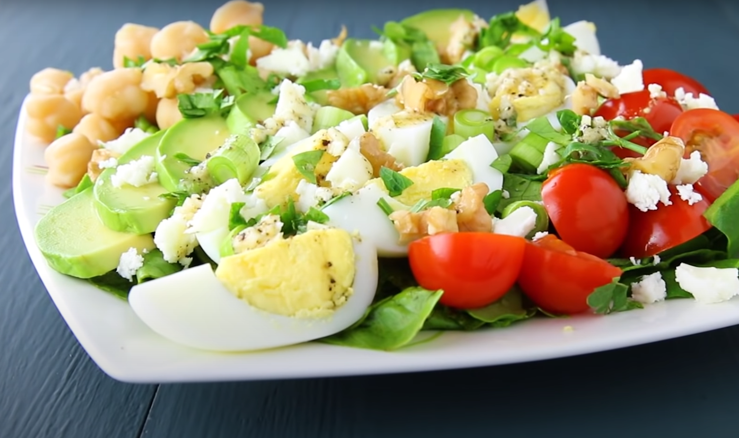 1.W dużej misce wymieszaj szpinak oraz sałatę rzymską. Następnie dodaj pokrojone na pół pomidorki koktajlowe, pokrojone na mniejsze kawałki jajka oraz awokado, posiekaną dymkę, orzechy, natkę pietruszki, po czym wsyp ciecierzyce oraz ser fetę.