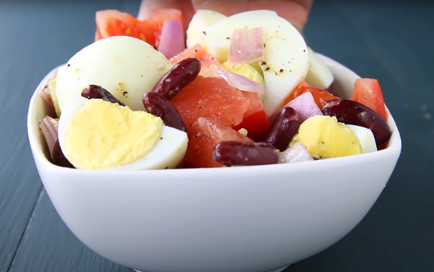 1.W misce wymieszaj pokrojone na ćwiartki jajka, plastry pomidora, fasolę oraz drobno pokrojoną cebulę. Z wymienionych składników przygotuj sos, którym polej całą sałatkę. Smacznego!