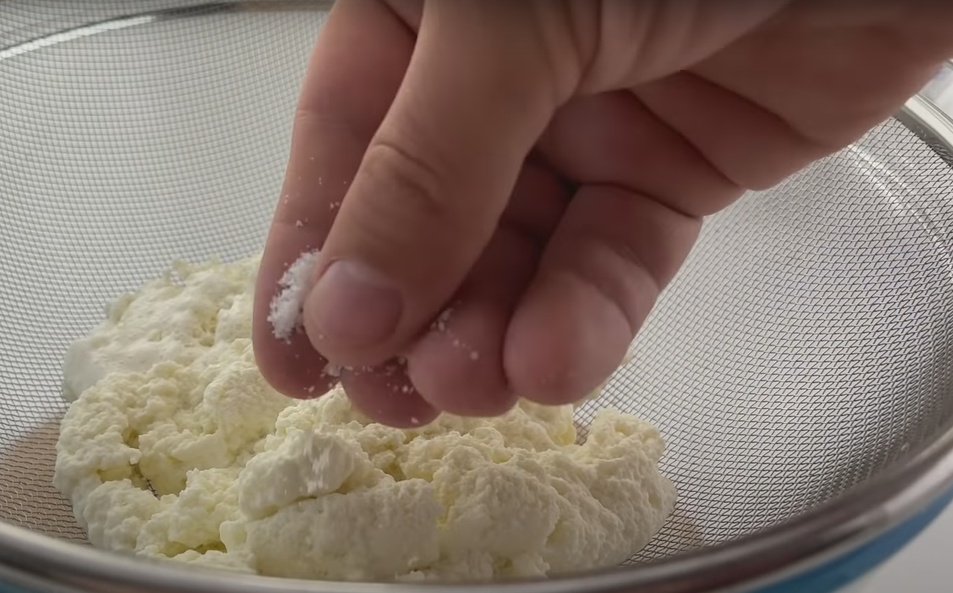 1. Do garnka wlej mleko, następnie go zgotuj. Do gotującego się mleka wlej wcześnie wyciśnięty sok z cytryny. Ustaw ogień na minimum i dokładnie mieszaj, następnie poczekać aż oddzieli się serwatka. Połóż na sito, i czekaj aż odcedzi się z reszty płynu, dodaj soli.