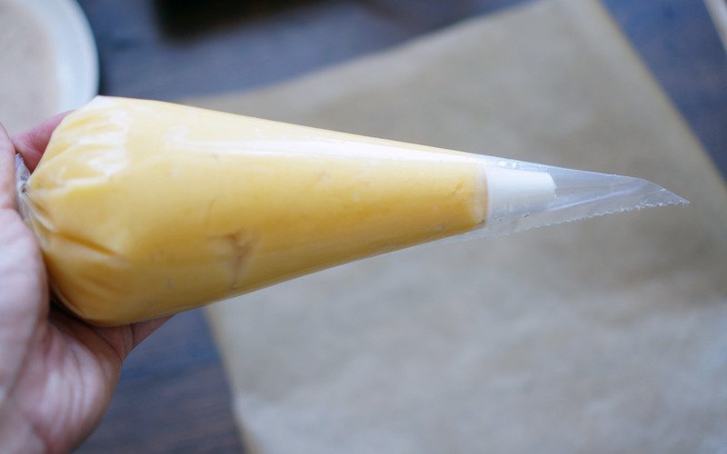 Gładką masę zdejmij z ognia. Nie przerywając mieszania, dodaj jajka. Mieszaj do momentu połączenia się składników. Kiedy nasze ciasto jest już gotowe, będziemy potrzebować rękawa cukierniczego. Przekładamy do niego przygotowaną masę, a następnie obcinamy końcówkę.