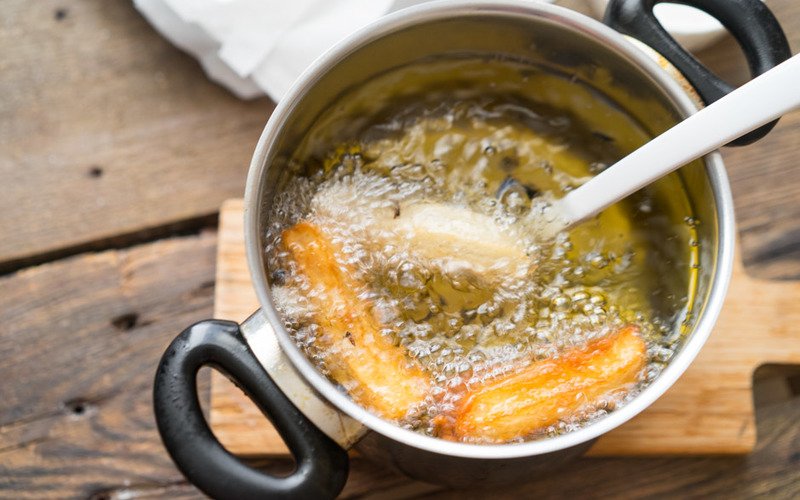 Na głębokiej patelni lub w garnku rozgrzewamy olej. Ciasto umieszczone w rękawie powoli wyciskamy na głęboki olej. Wielkość wyciskanych kawałków powinna mieć ok. 5-7 cm. Kiedy kawałki ciasta będą zarumienione, wyciągamy je z oleju. Odkładamy pałeczki na ręcznik papierowy, aby odsączyć nadmiar oleju.