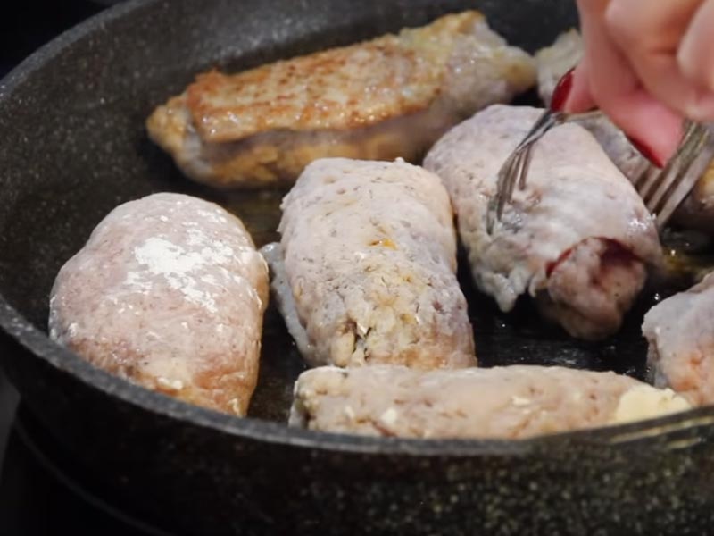 Gdy dobiegnie czas marynowania mięsa oraz cebuli, wyłóż je na deskę. Układaj plasterek mięsa, na to dawaj porcję cebuli i zwijaj w rolady. Następnie każdą roladkę panieruj w mące. Na patelni rozgrzej olej i smaż rolady na złoty kolor z każdej strony. Po usmażeniu rolady układaj na półmisku.