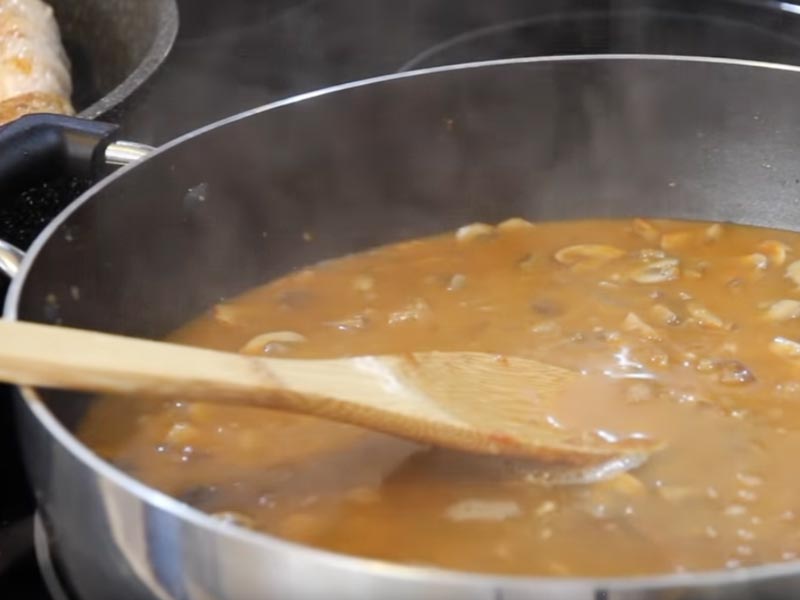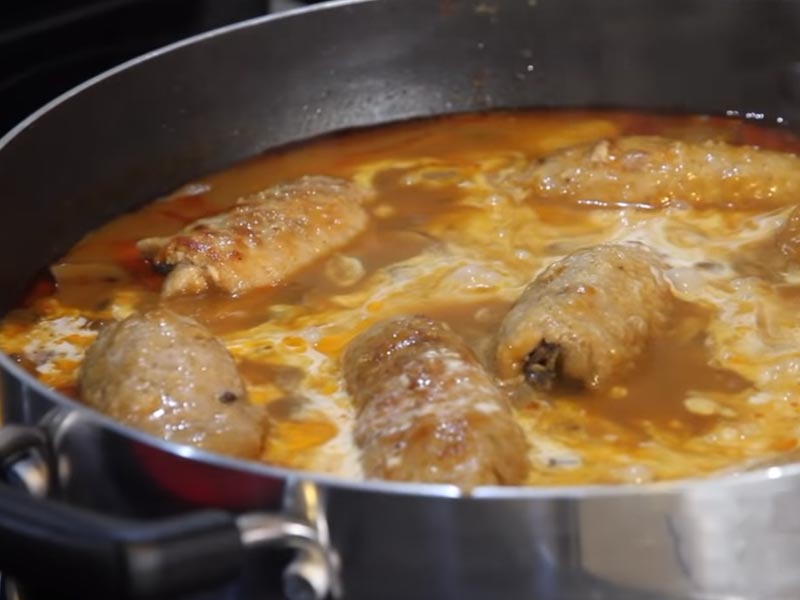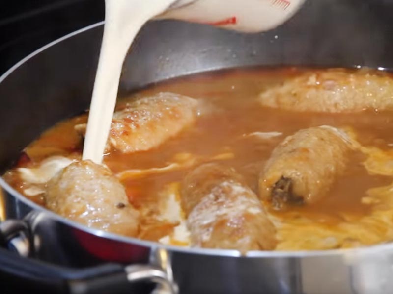 Nadeszła kolej, aby połączyć sos z roladkami. Roladki wkładaj na patelnię z sosem. Sosu powinno być na tyle, aby całkiem przykryć roladki. Jeśli się tak nie stanie to nic, wystarczy dolać do sosu więcej wody. Roladki z sosem zagotuj, następnie skręć palnik i duś na małym ogniu pod przykryciem przez 40 minut.