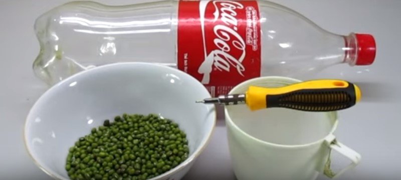 1.Dokładnie umyj cała butelkę plastikową. Za pomocą ostrego śrubokręta zrób w niej dziury. Pamiętaj, że otwory nie mogą być dużo większe od nasion.