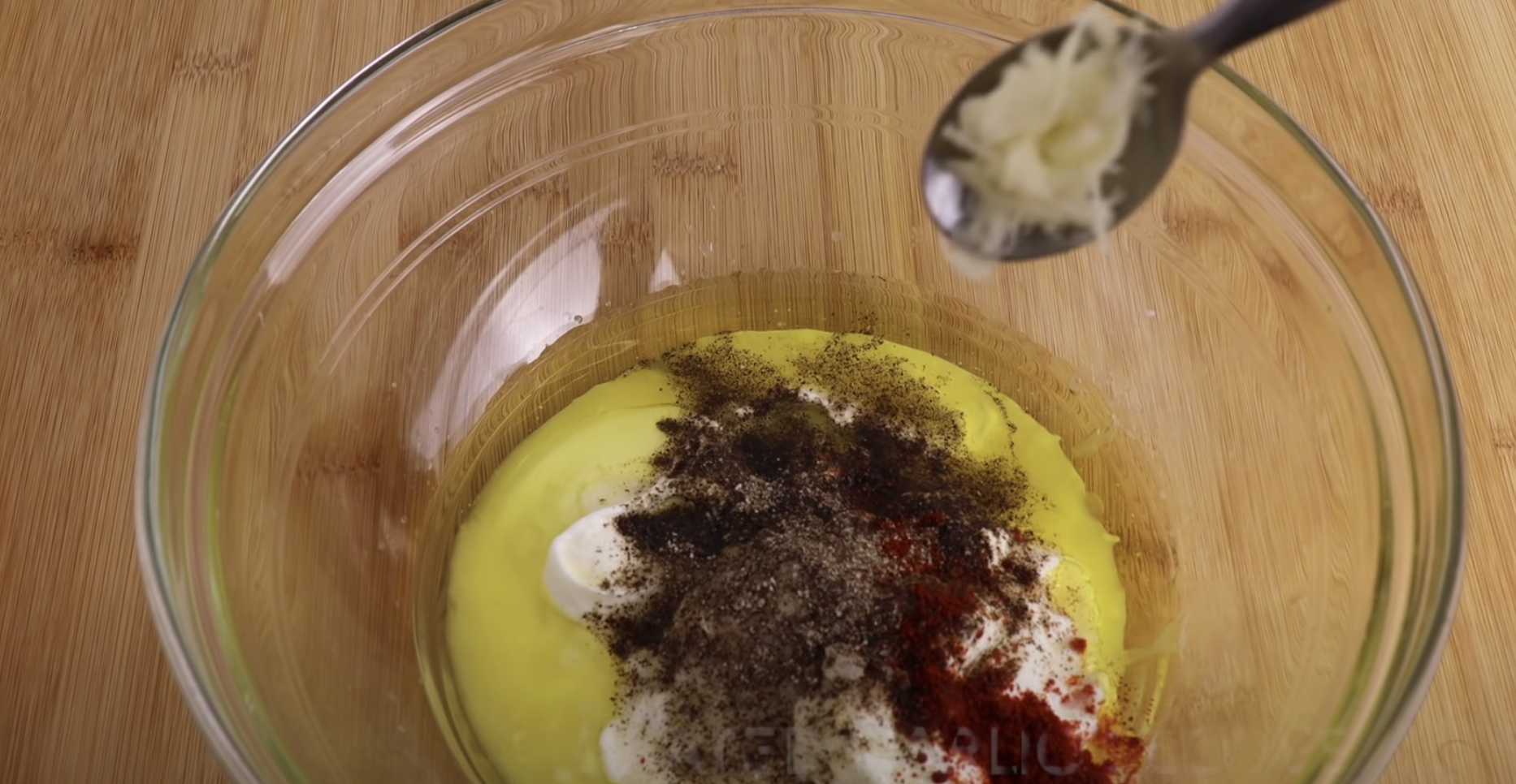 Przygotuj marynatę, przygotowując miskę. Wymieszaj jogurt naturalny i oliwę z oliwek. Dodaj przyprawy, musztardę, rozgnieciony czosnek i pozostałe składniki. Wymieszać wszystko razem do uzyskania gładkiej konsystencji.