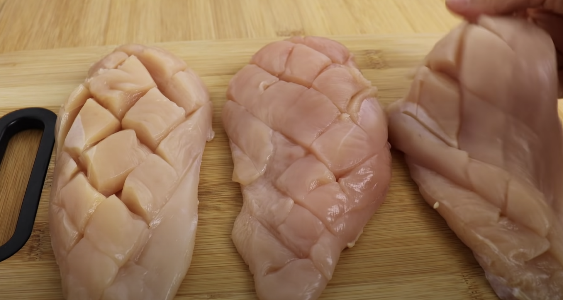 Po umyciu piersi z kurczaka osusz je, a następnie natnij tak, aby powstała na nich kratka. Upewnij się, że nie przecinasz piersi z kurczaka.