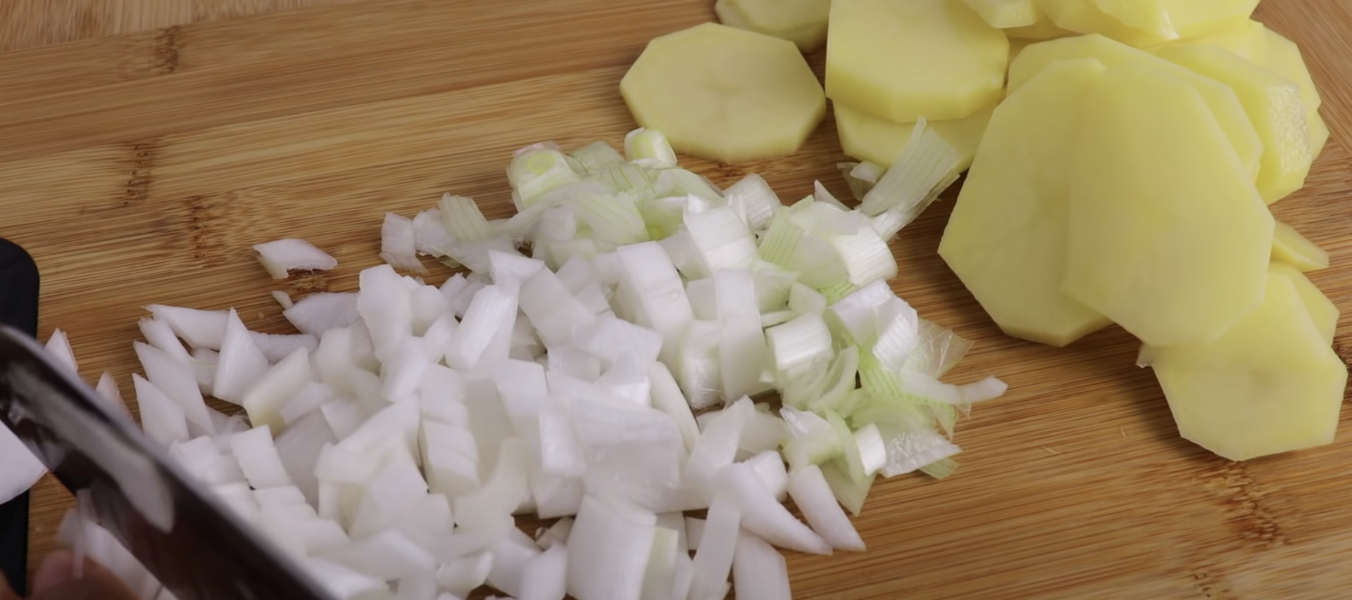 Marynatę należy nałożyć na piersi kurczaka. Upewnić się, że marynata pokrywa każdy centymetr. Odstawić na bok. Grzyby i cebulę pokroić w drobną kostkę. Ziemniaki pokroić w cienkie plasterki (ok. 1 cm). Nastawić piekarnik na 180°C, a następnie włączyć grzanie wstępne.