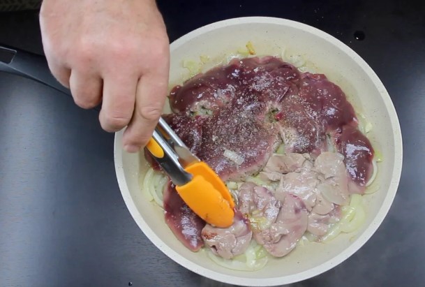 2.Dzięki dodatku cebuli , smak wątróbki jest jeszcze pyszniejszy. Dodanie większej ilości wątróbki wpłynie także korzystnie na smak potrawy.