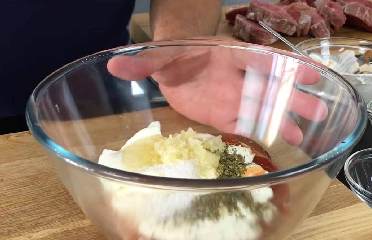2. Teraz przygotuj marynatę: śmietanę, wymieszaj z sosem pomidorowym, dodaj miód, sok z cytryny, czosnek, paprykę, kurkumę, chmiel suneli, cebulę pokrojoną w kostkę, posiekane zioła i sól. Dokładnie wszystko wymieszaj.