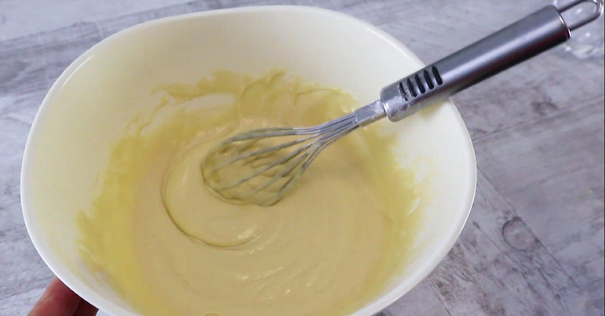 W kuchence mikrofalowej rozpuść masło. Po lekkim ostygnięciu, połowę porcji dorzuć do wcześniej przyrządzonej masy. Całość wymieszaj. Kolejno dolej mleko i wszystko dokładnie wymieszaj.