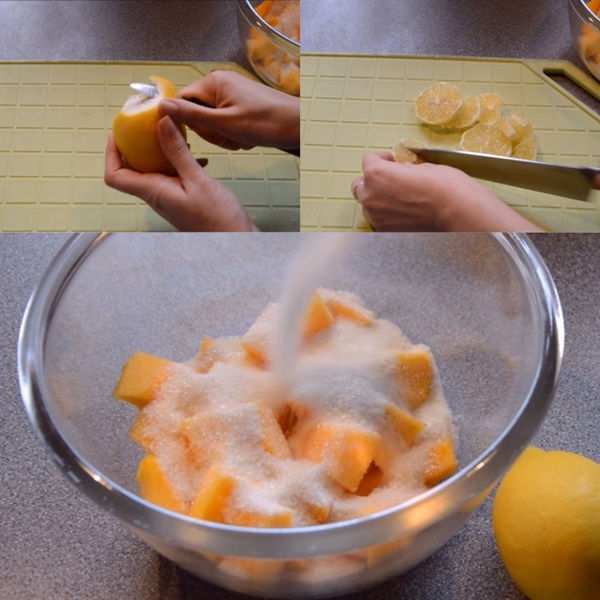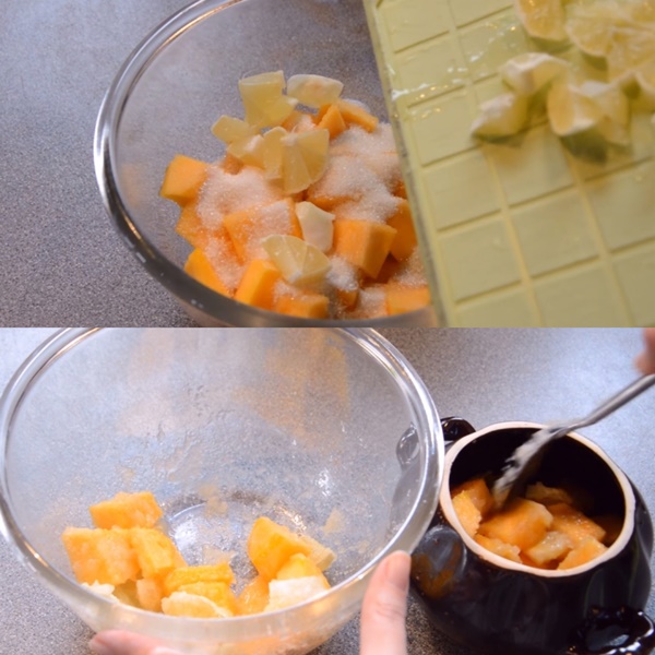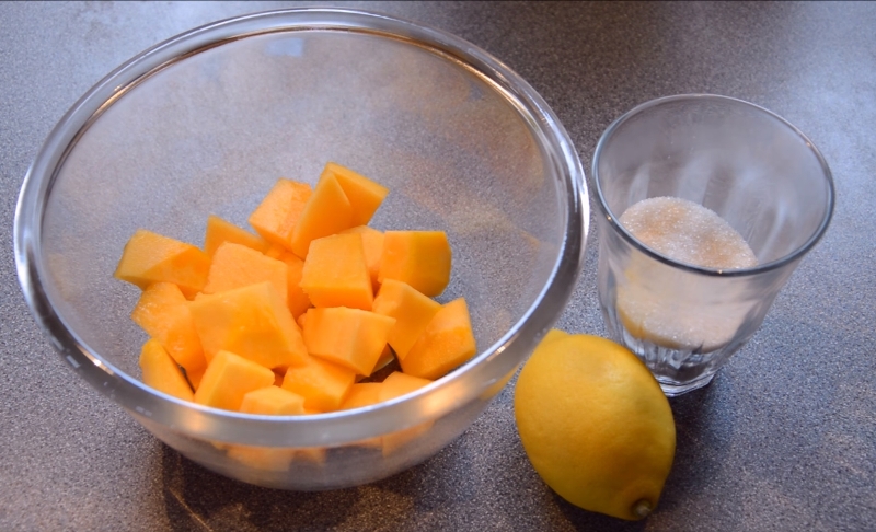 2. W wygodnej misce wymieszaj dynię z cukrem. Następnie dodaj obraną i pokrojoną w małą kostkę cytrynę.