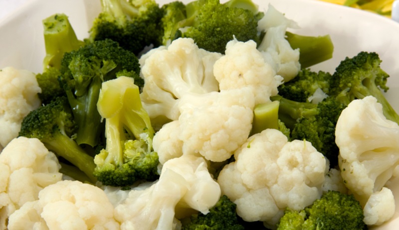 1. Podziel brokuła i kalafior na różyczki. Następnie zagotuj w garnku lekko osoloną wodę i blanszuj je przez 3 minuty od momentu ponownego zagotowania się wody. Potem odcedź i pozostaw do wystygnięcia.