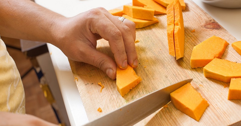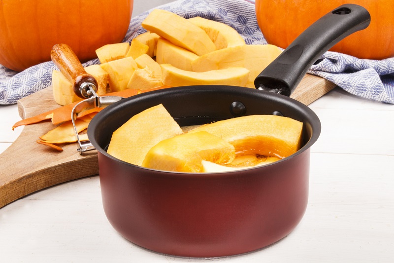 1. Obierz dynię, pokrój na mniejsze kawałki i gotuj przez 10-15 minut (musi być pół miękka).