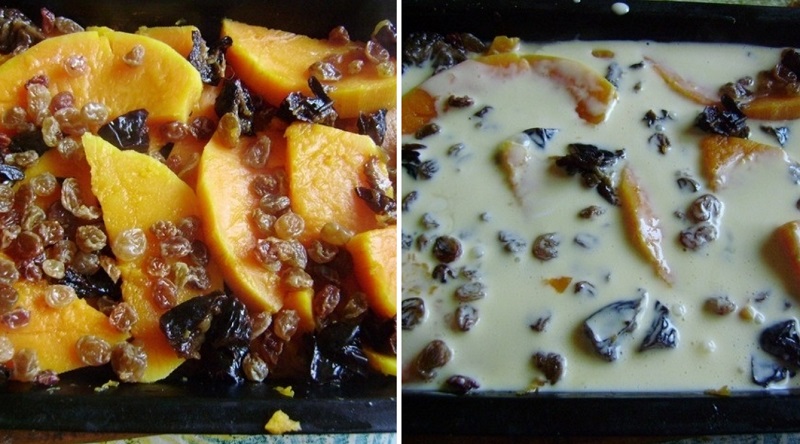 4. Gotowaną dynię umieść w naczyniu żaroodpornym, dodaj rodzynki i suszone śliwki, a następnie zalej wszystko śmietaną.