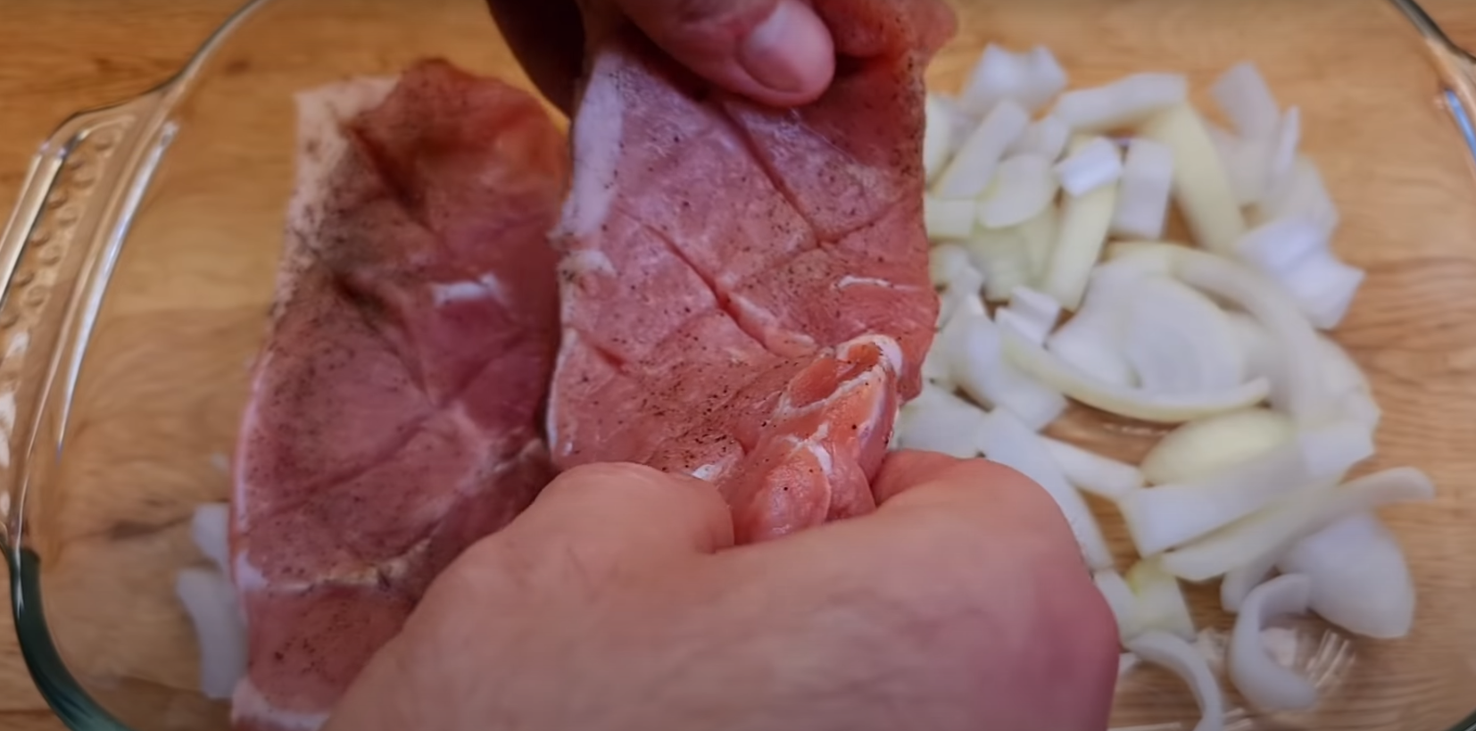 1.Umyj , oczyść oraz ręcznikiem papierowym osusz schab. Następnie wzorem w kratkę ponacinaj plastry mięsa oraz do smaku dopraw pieprzem i solą z każdej strony.