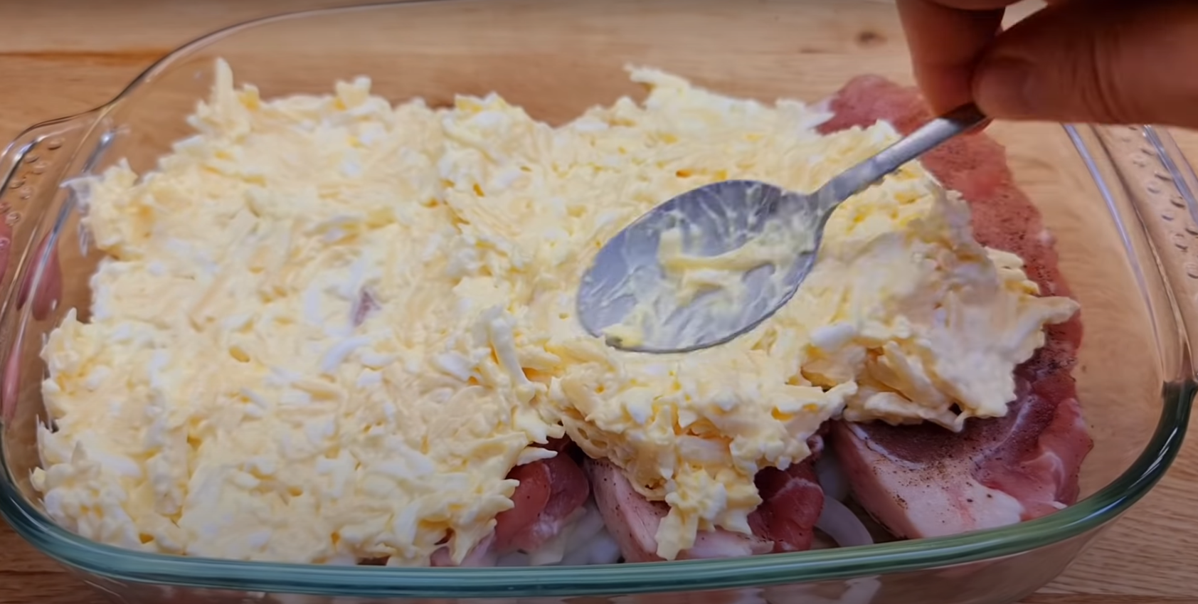 2.Obierz cebulę, następnie pokrój ją w pół piórka i w naczyniu żaroodpornym poukładaj na dnie. Plastry schabu połóż na wyłożoną cebulę. Do miski włóż jajka pokrojone w kosteczkę, na grubych oczkach starty ser oraz majonez, dokładnie całość wymieszaj. Tak przygotowaną masę układaj na całej powierzchni wyłożonego mięsa.