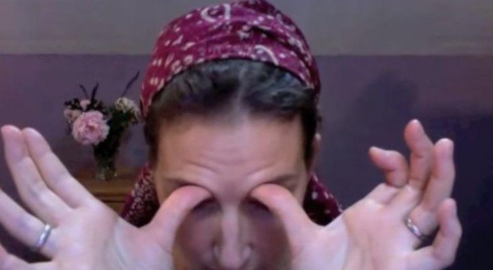 Umieść palce (np.: środkowe) na początku brwi. Łokcie oprzyj na kolanach lub stole. Głowa pochylona. Zwiększaj powoli siłę nacisku. Po odczuciu zmiany ciśnienia w zatokach, przesuń opuszki palców na środek brwi.