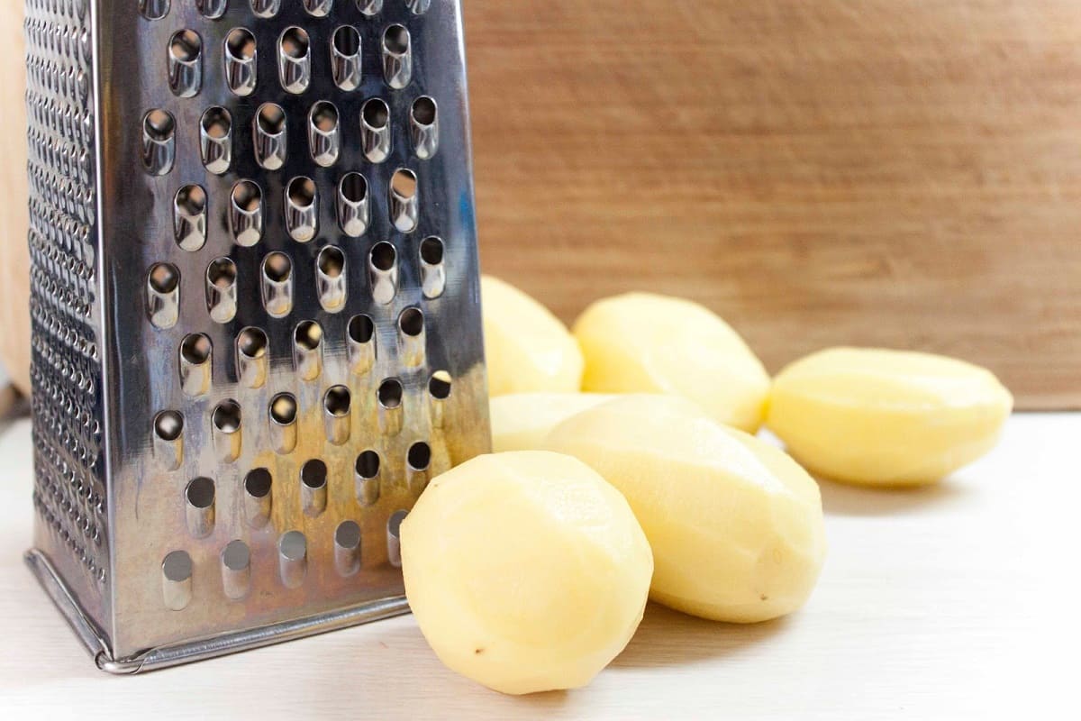 3.Obierz, umyj oraz zetrzyj o grubych oczkach na tarce ziemniaki . Odsącz nadmiar wody.