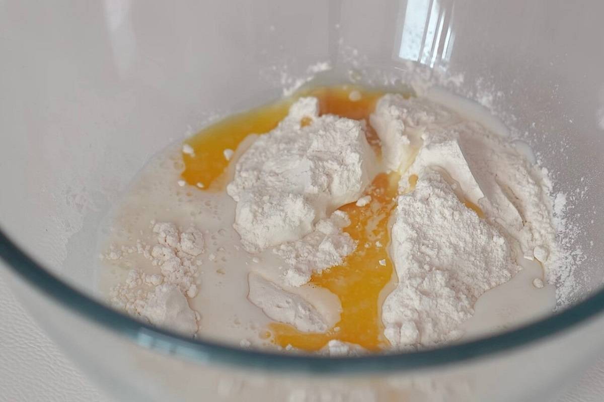 1.Na sam początek przygotuj ciasto. Do miski wlej mleko, roztopione masło, dodaj mąkę oraz sól.