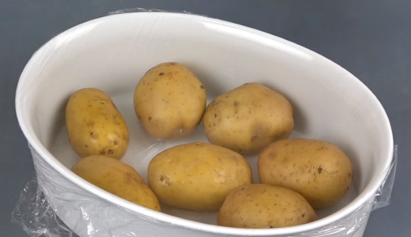 4. Umieść ziemniaki w kuchence mikrofalowej na 5-7 minut, wszystko zależy od wielkości ziemniaków. Wybierz maksymalną moc.